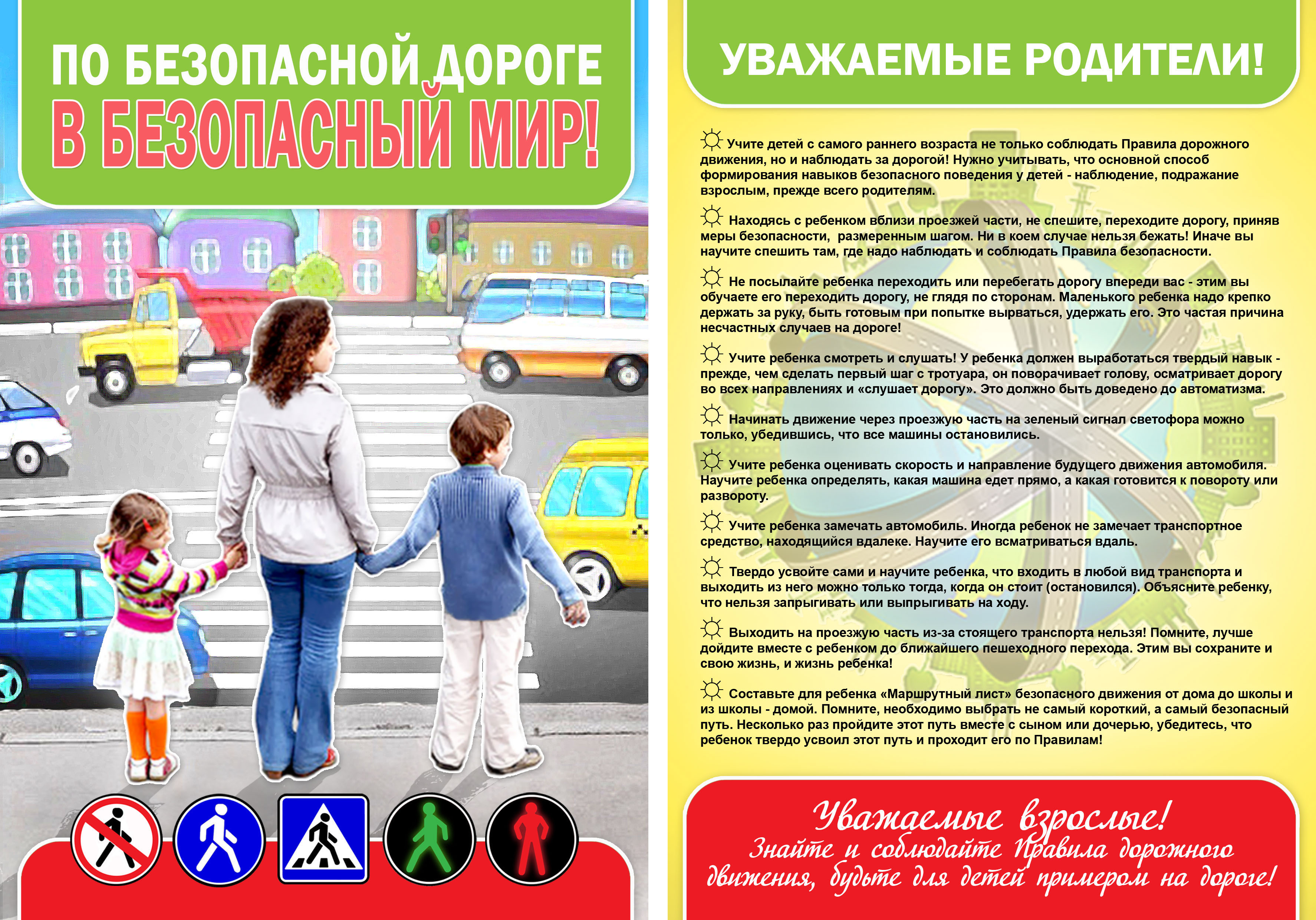 3. Не посылайте ребенка переходить или перебегать дорогу впереди вас - этим вы обучаете его переходить через дорогу, не глядя по сторонам. Маленького ребенка надо крепко держать за руку, быть готовым удержать при попытке вырваться - это типичная причина несчастных случаев.