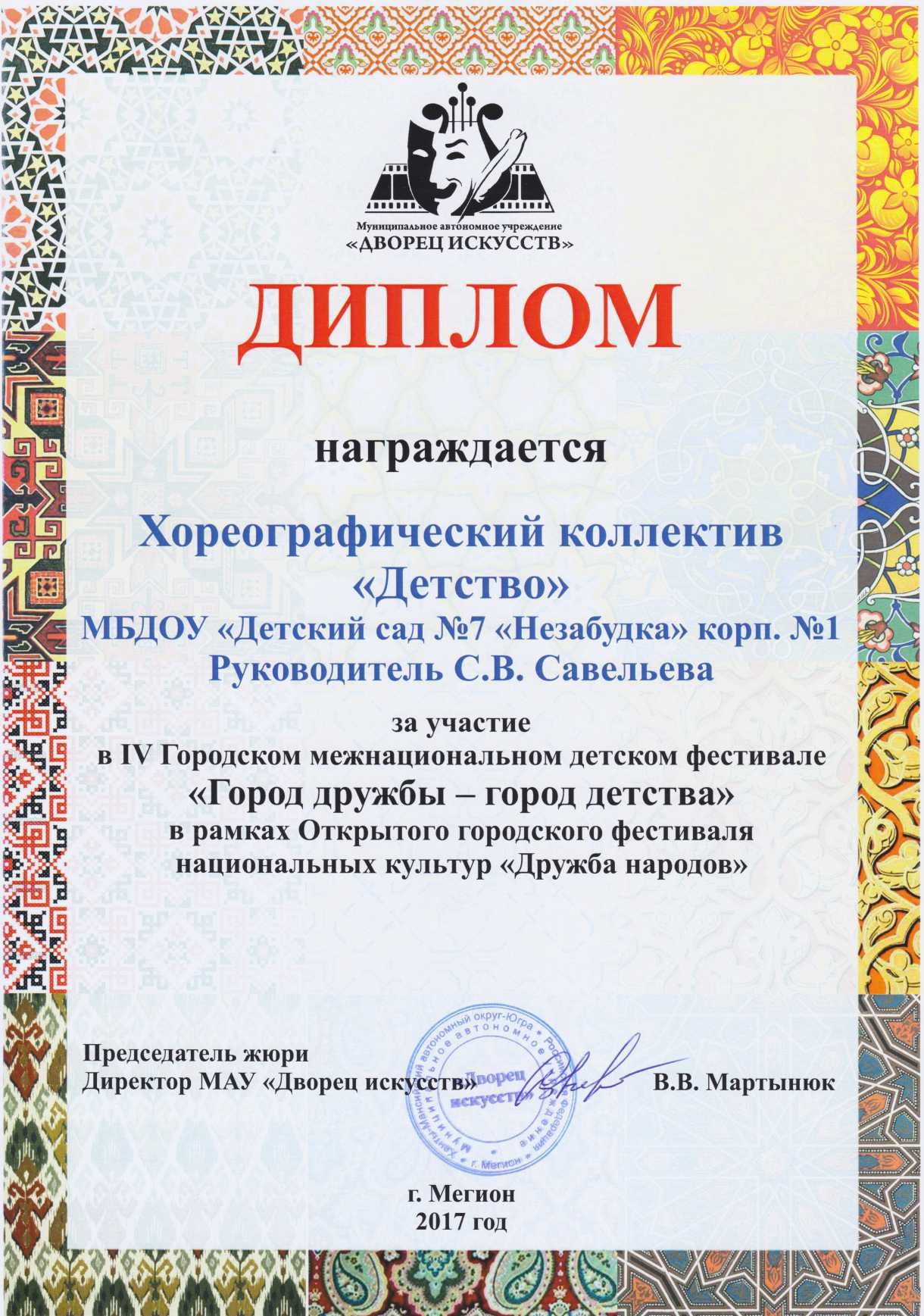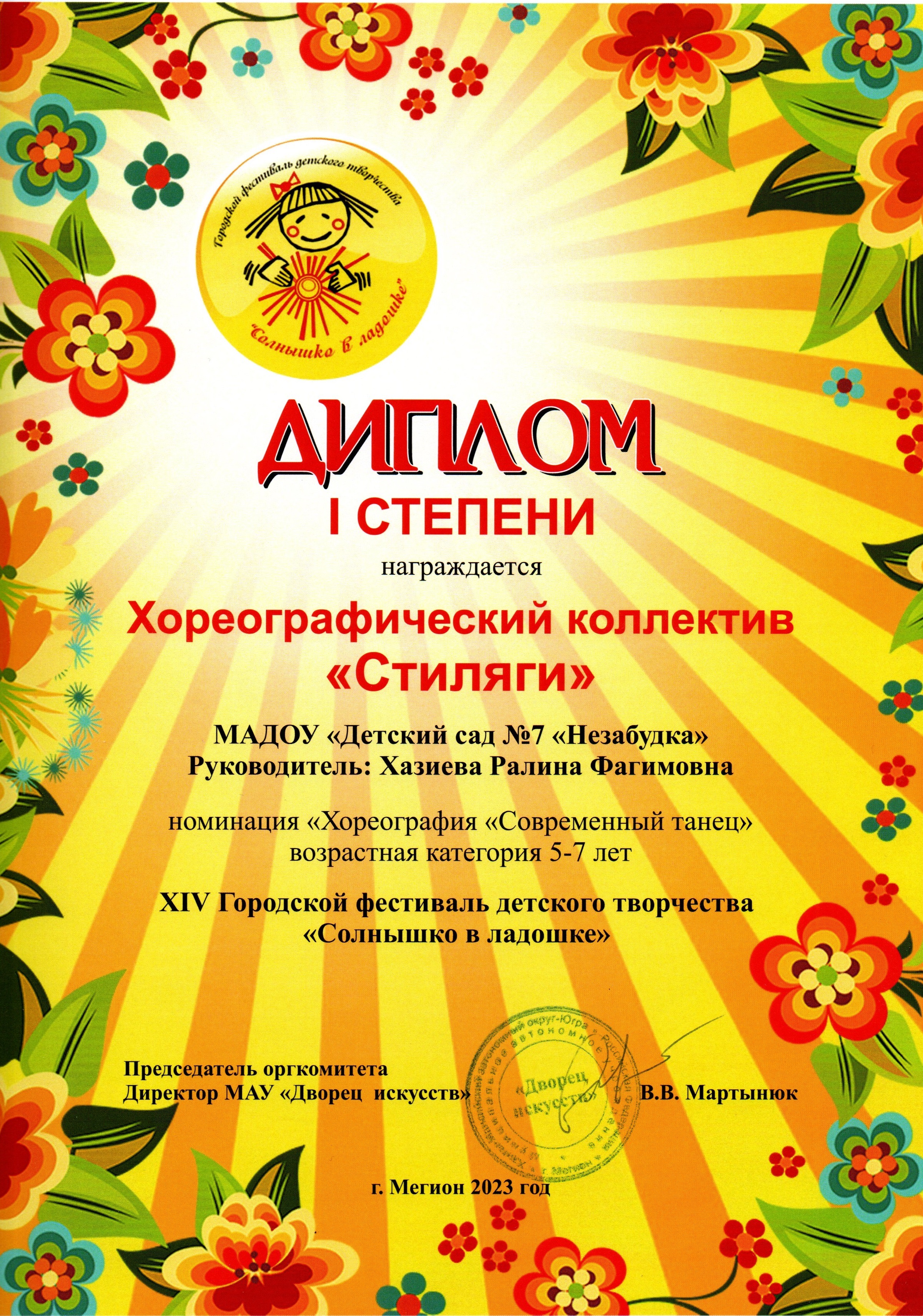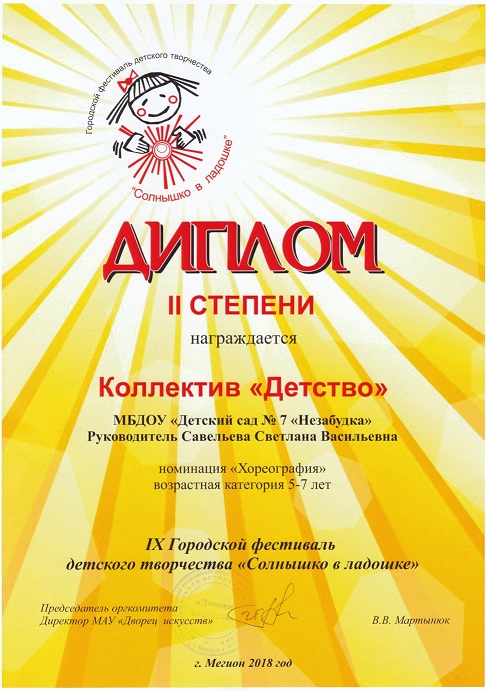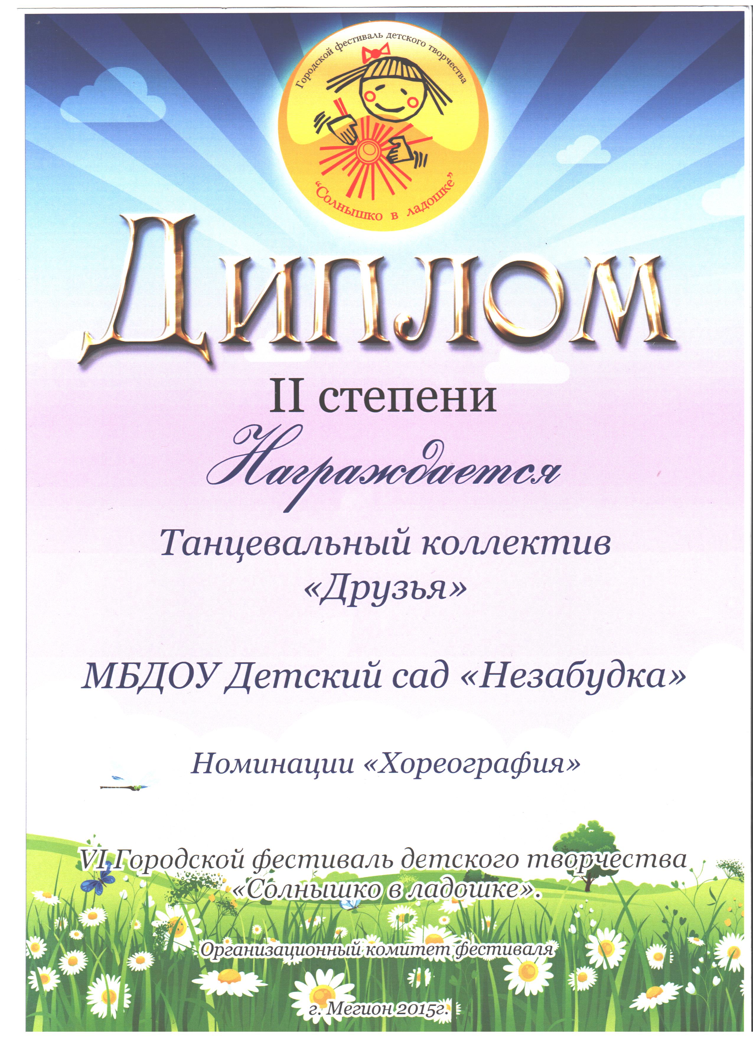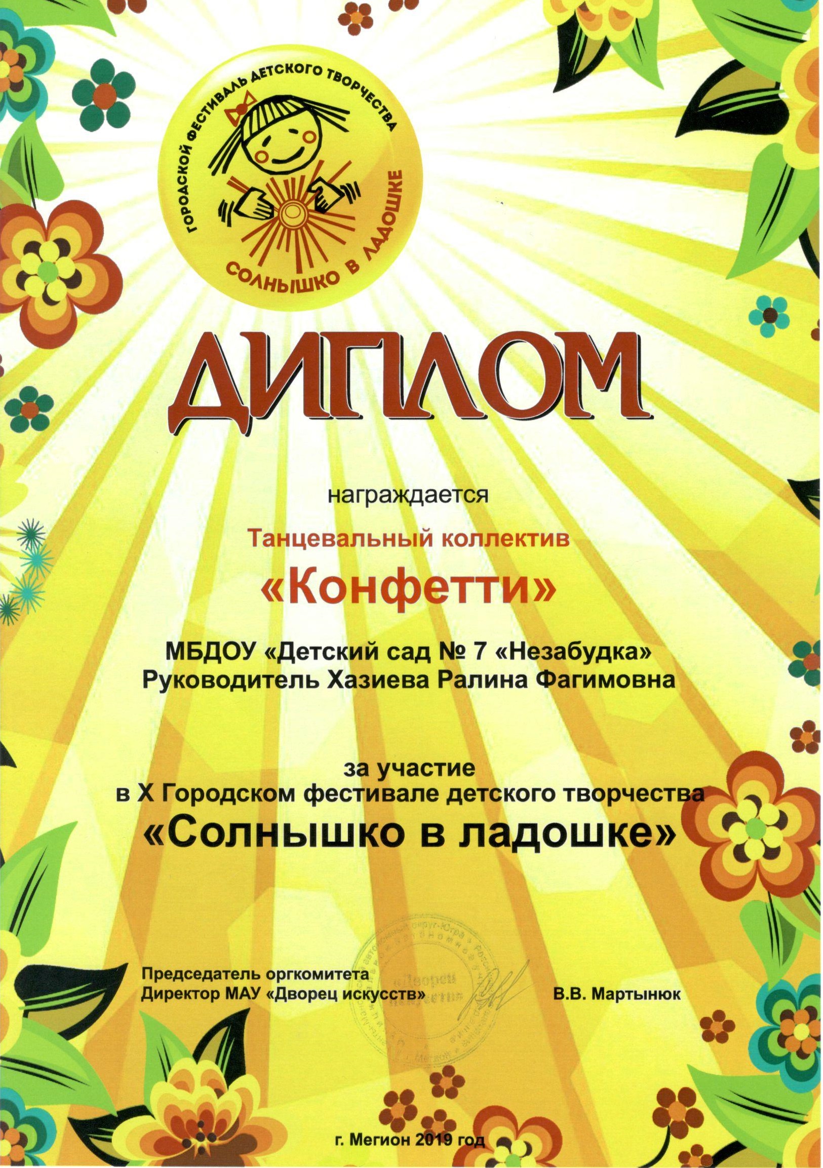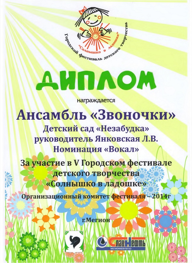 Диплом участника Х Городского фестиваля детского творчества "Солнышко в ладошке" |