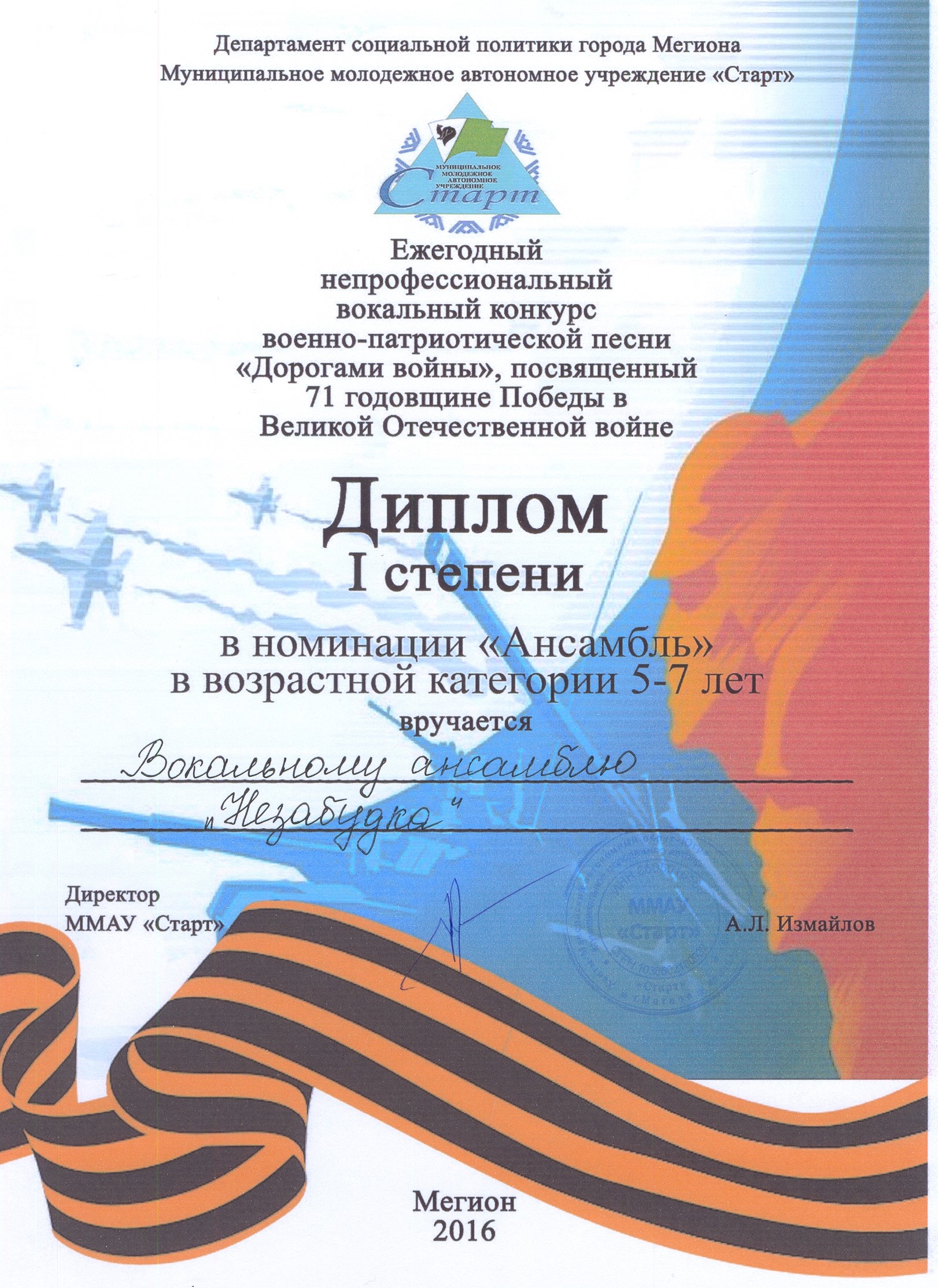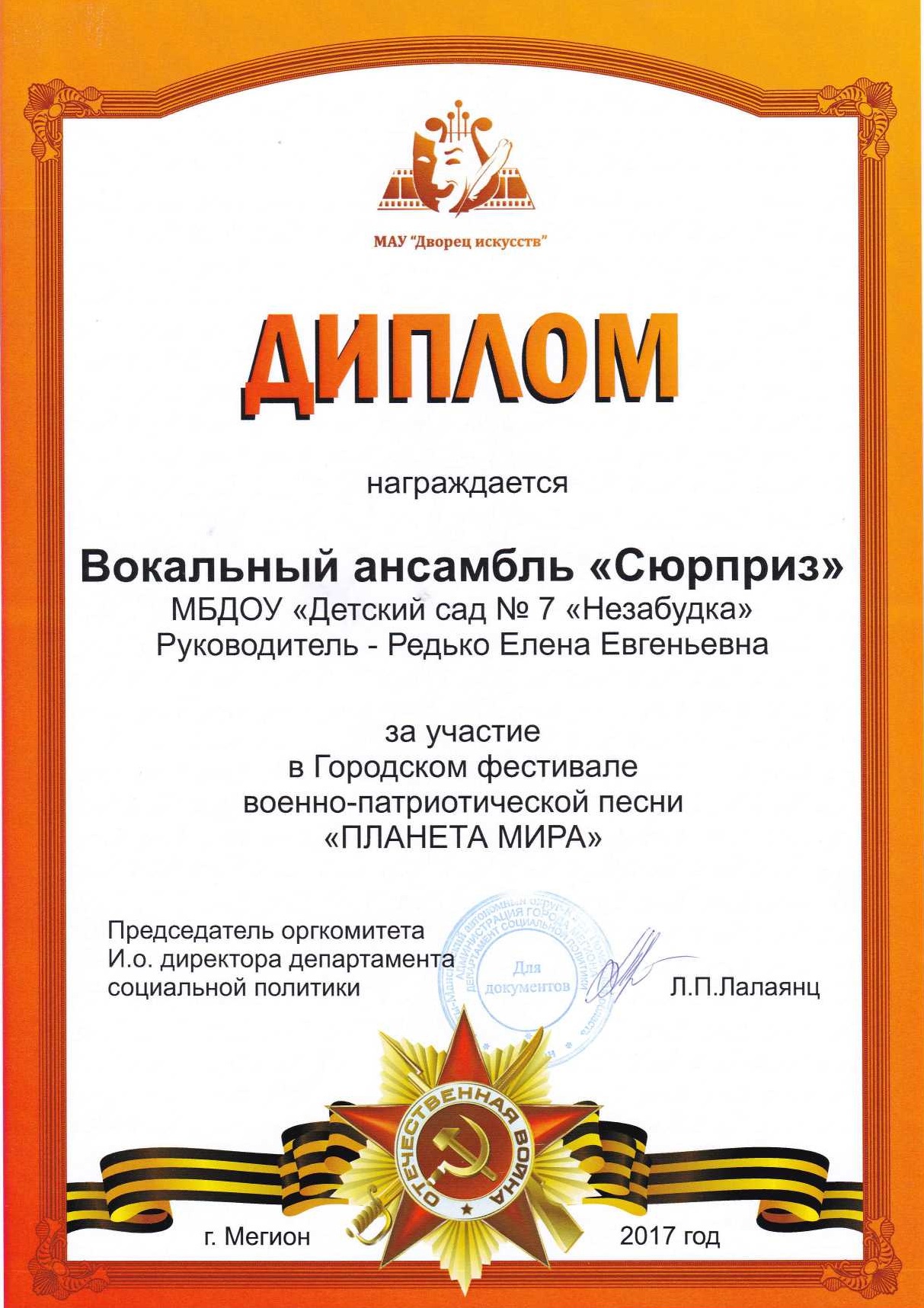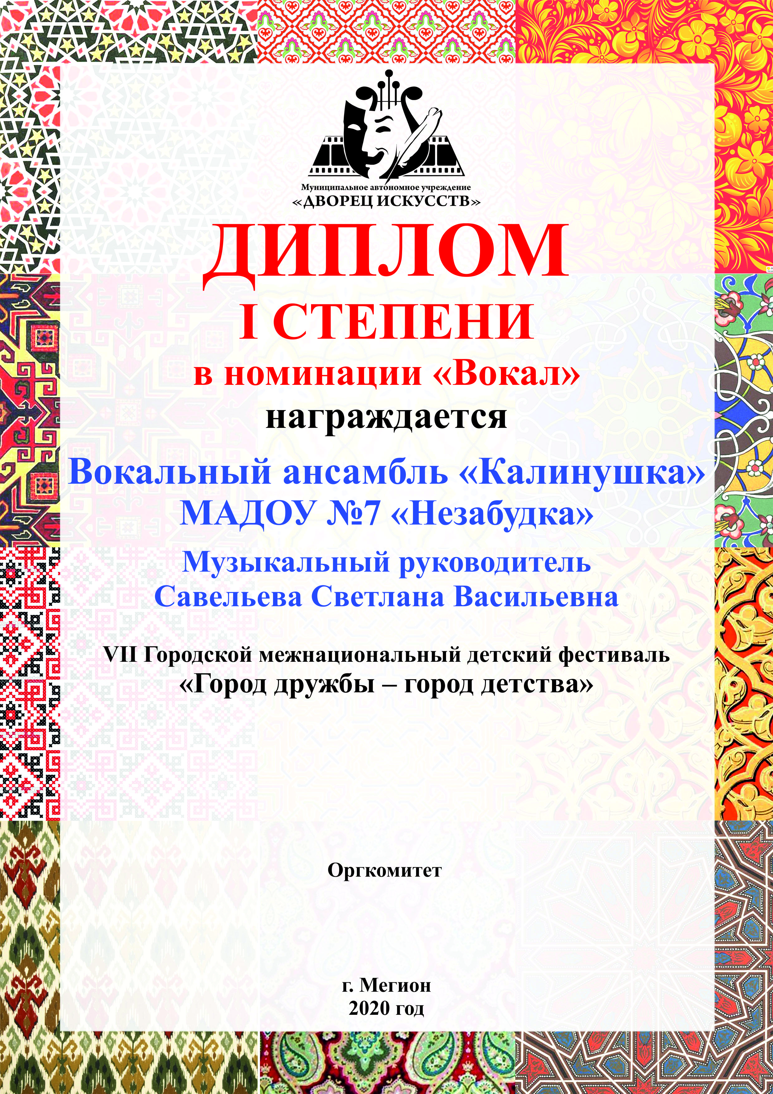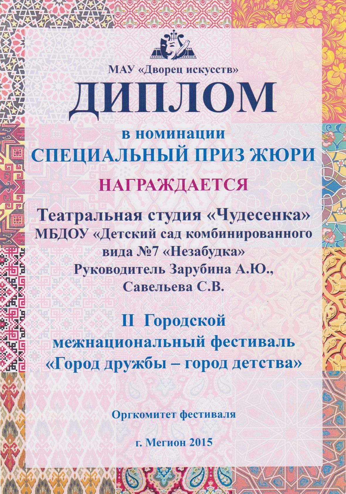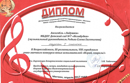 Диплом участника Х Городского фестиваля детского творчества "Солнышко в ладошке" |