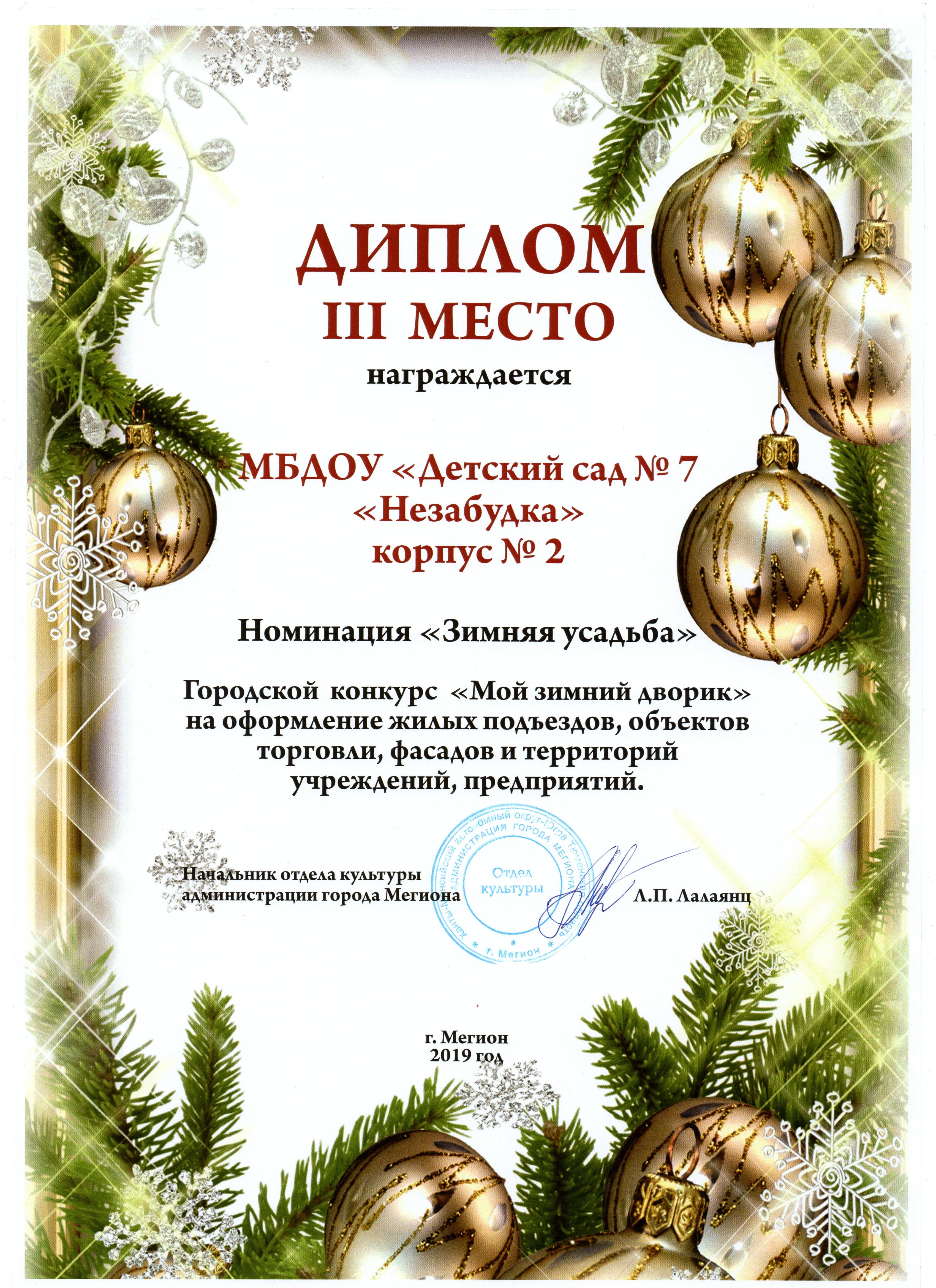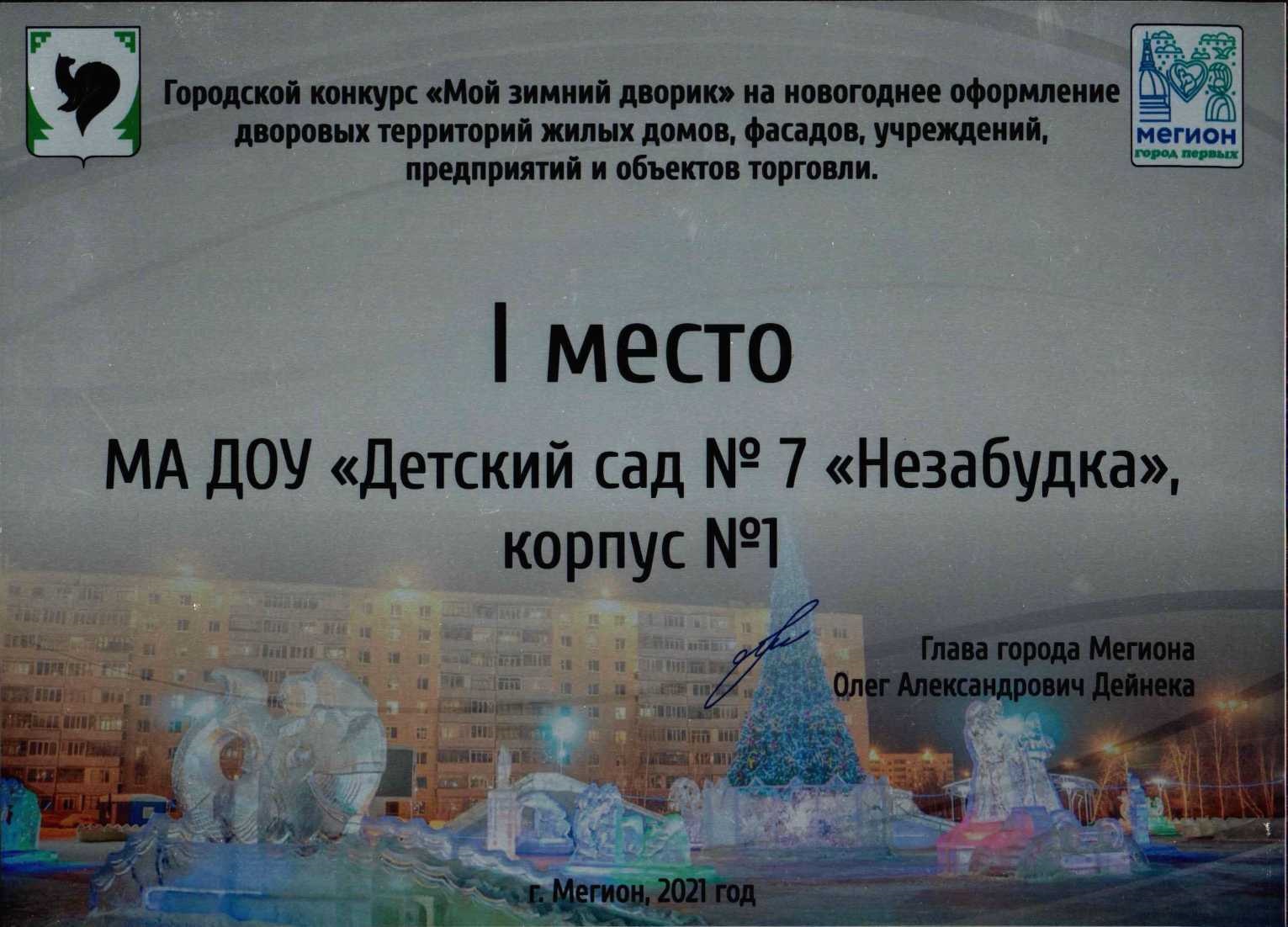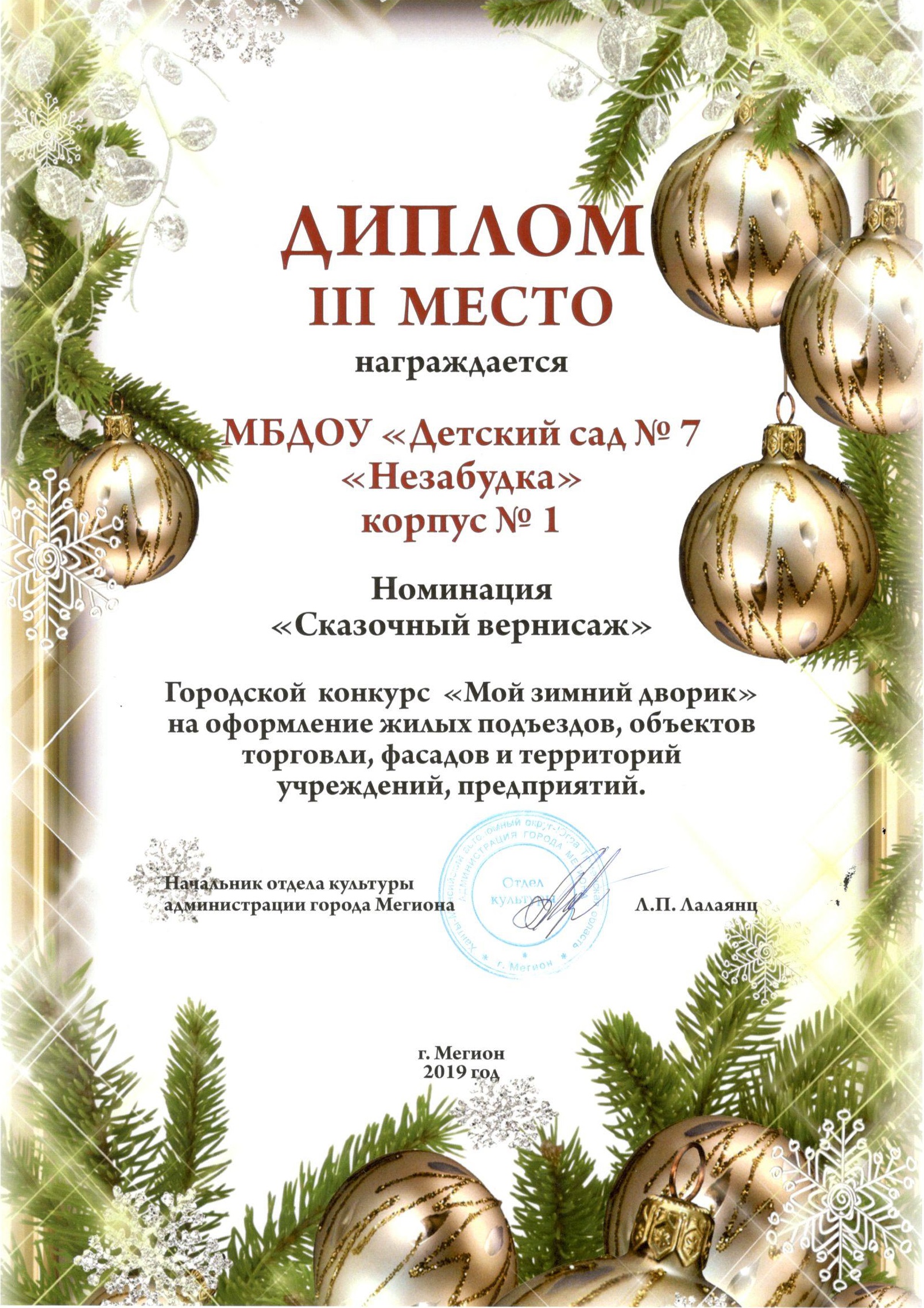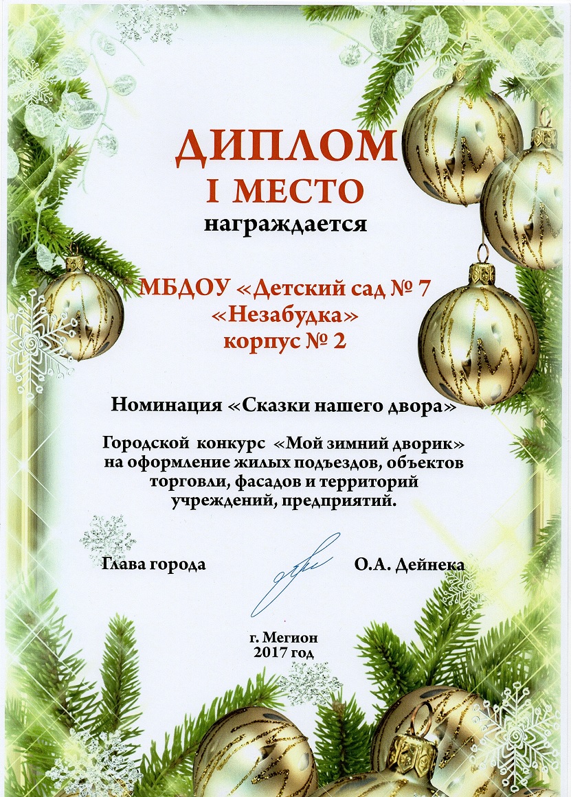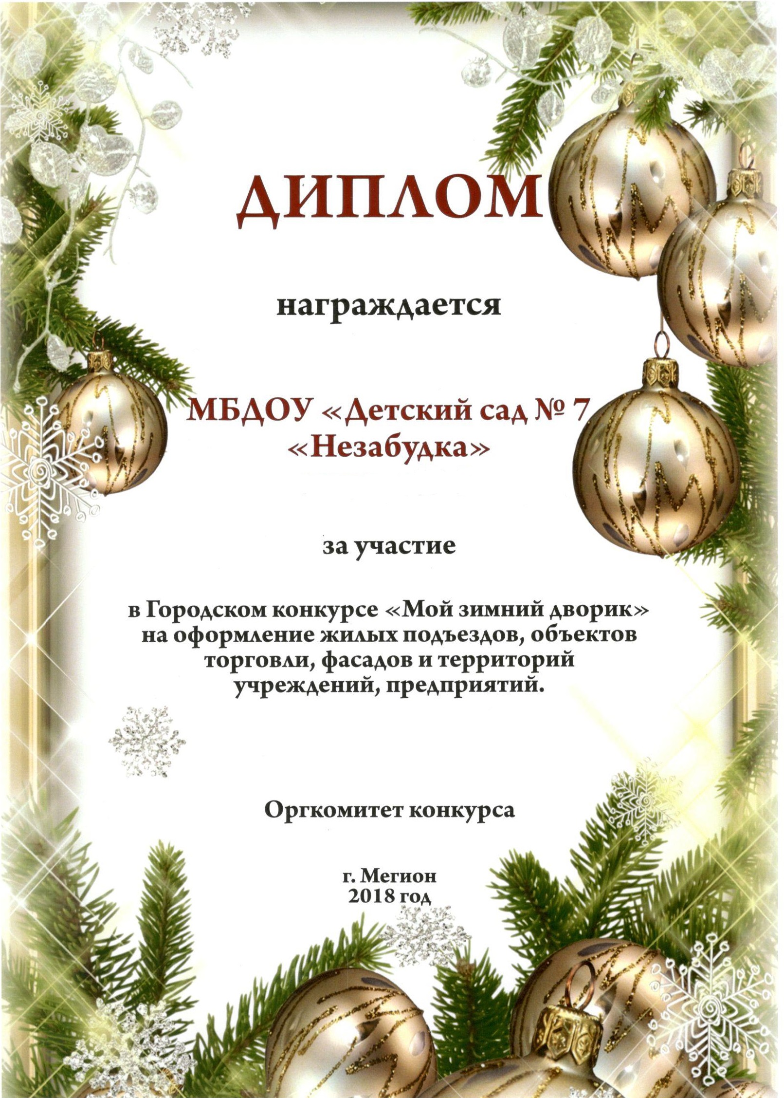 Диплом победителя городского конкурса на новогоднее оформление территорий "Мой зимний дворик" "Мегион ПРО чудеса" |