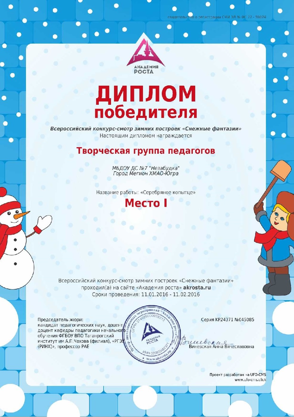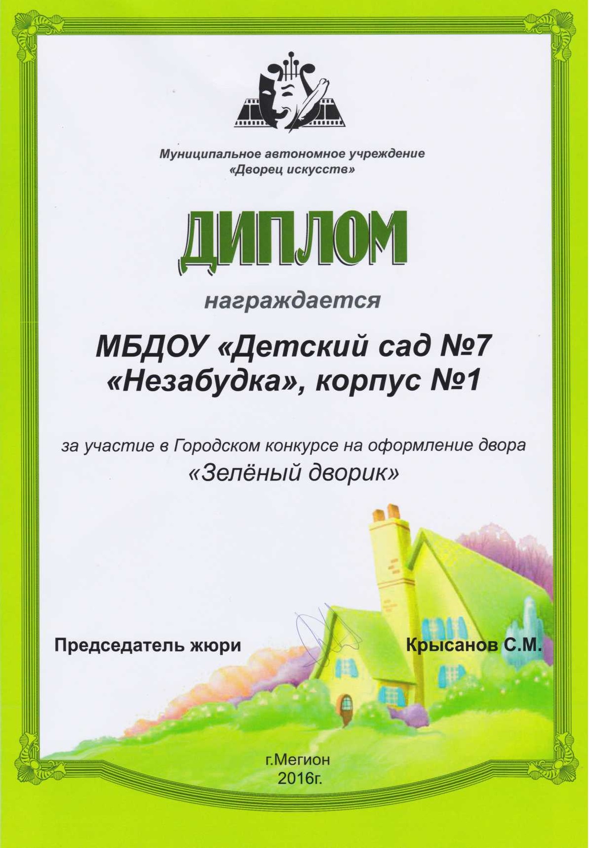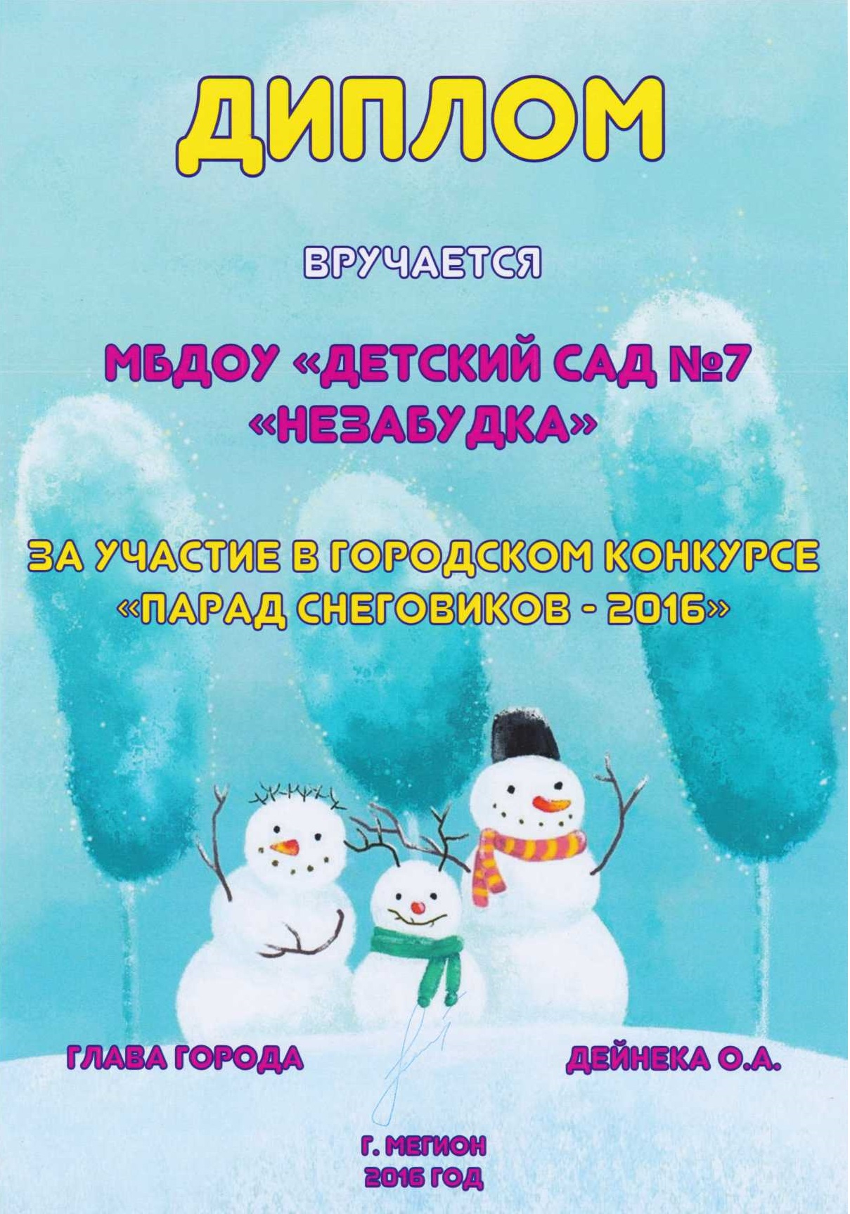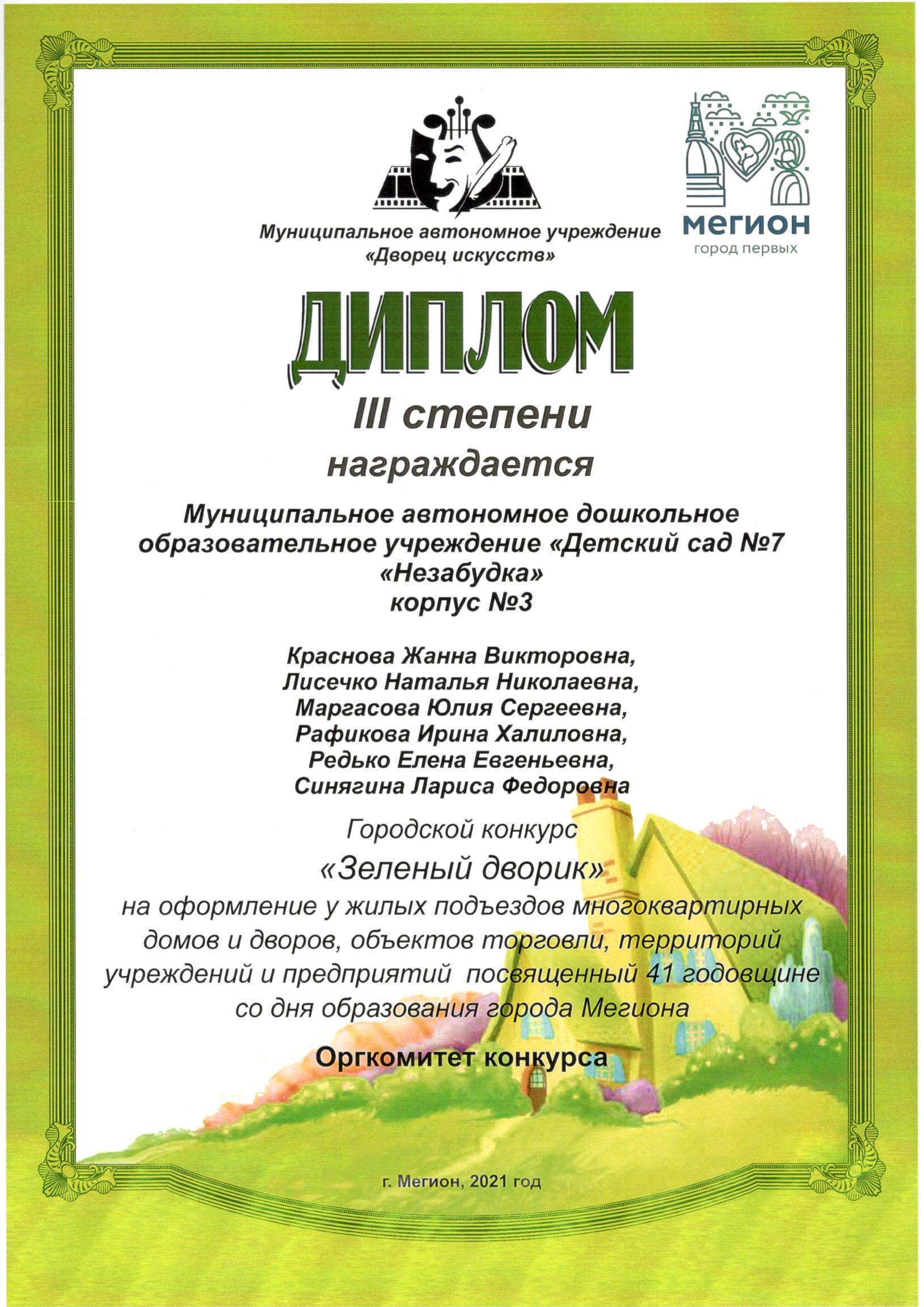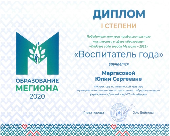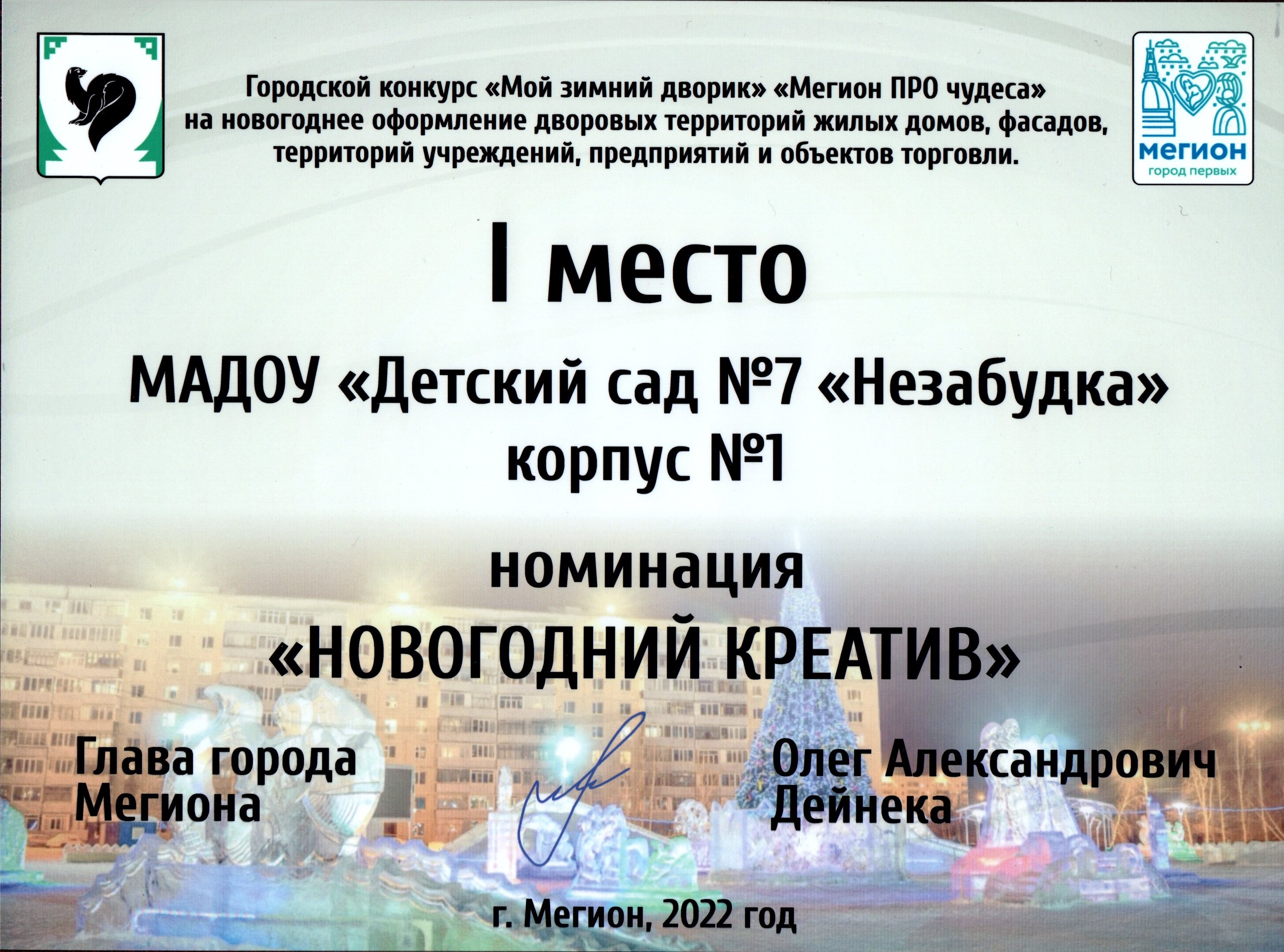 Диплом победителя городского конкурса на новогоднее оформление территорий "Мой зимний дворик" "Мегион ПРО чудеса" |