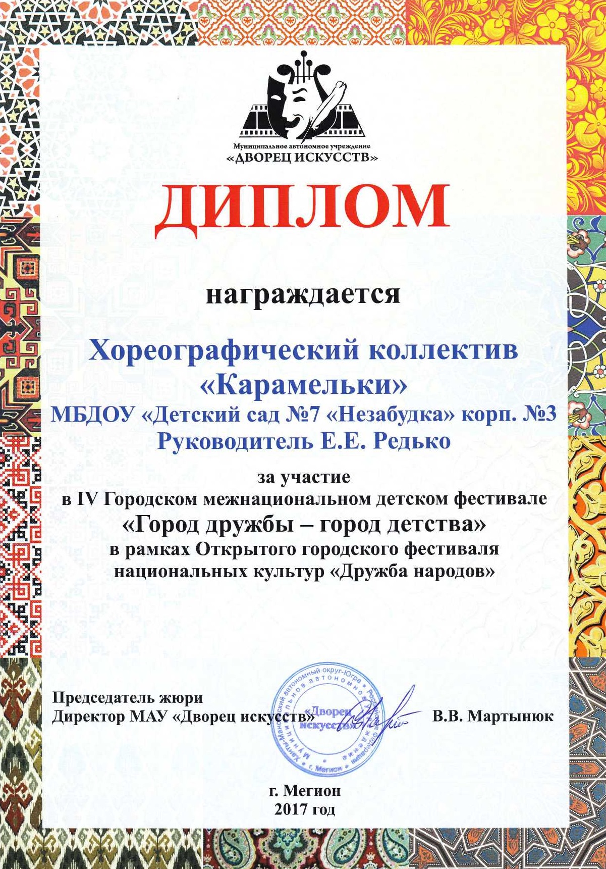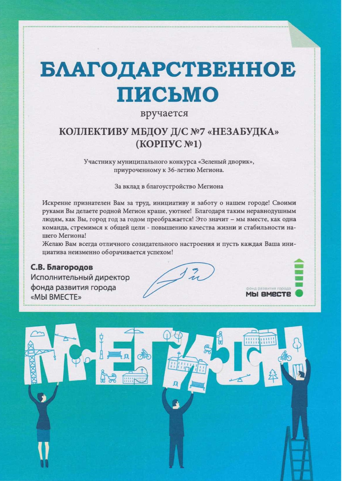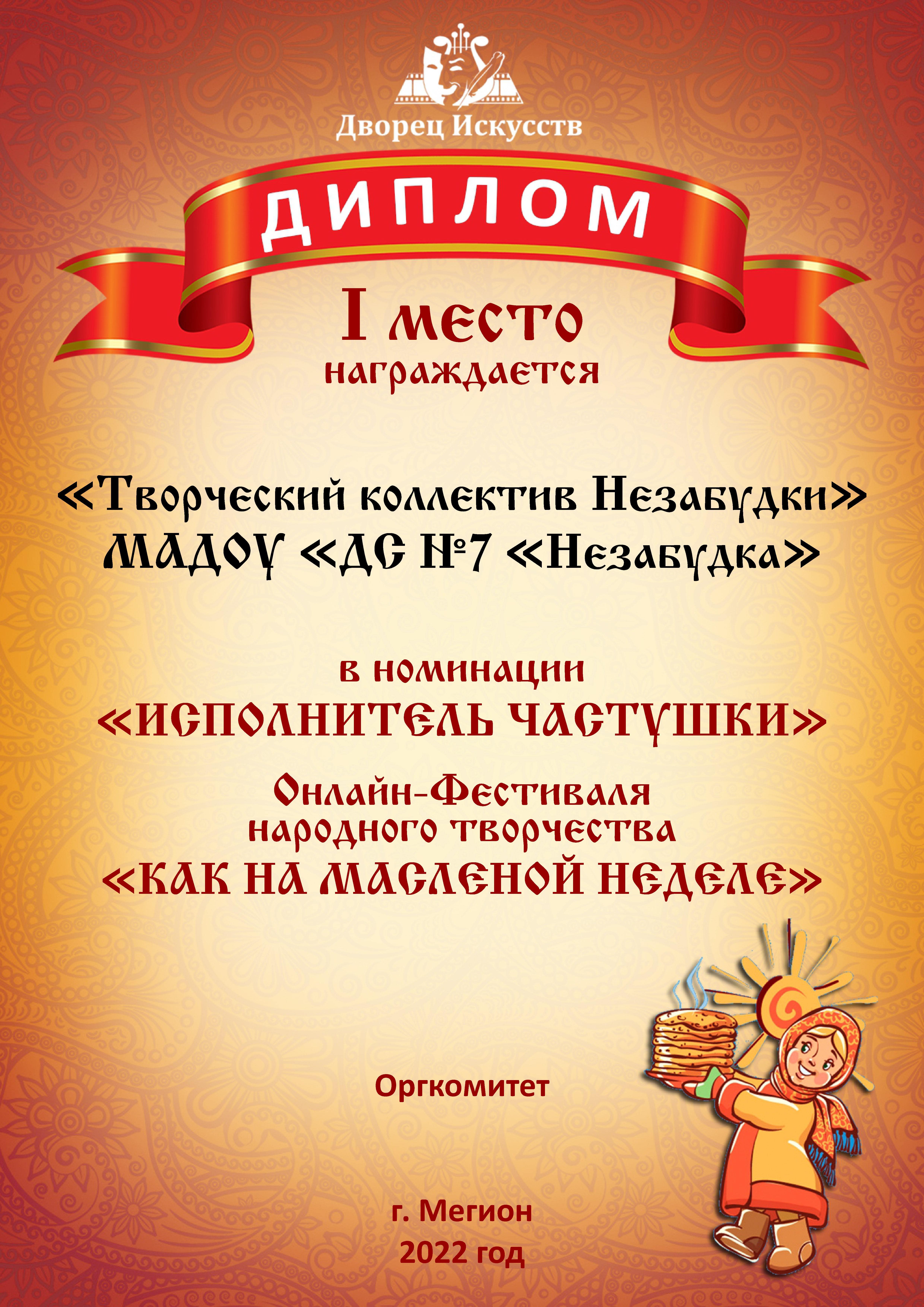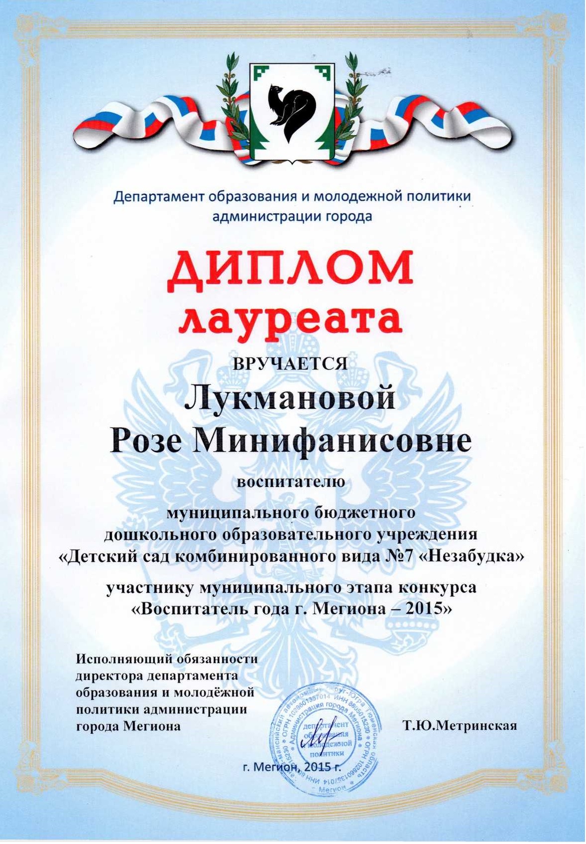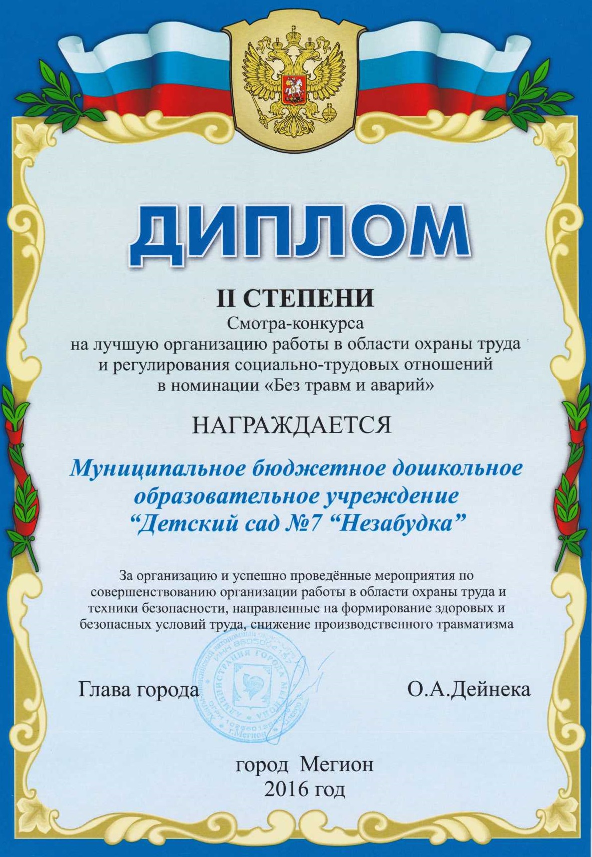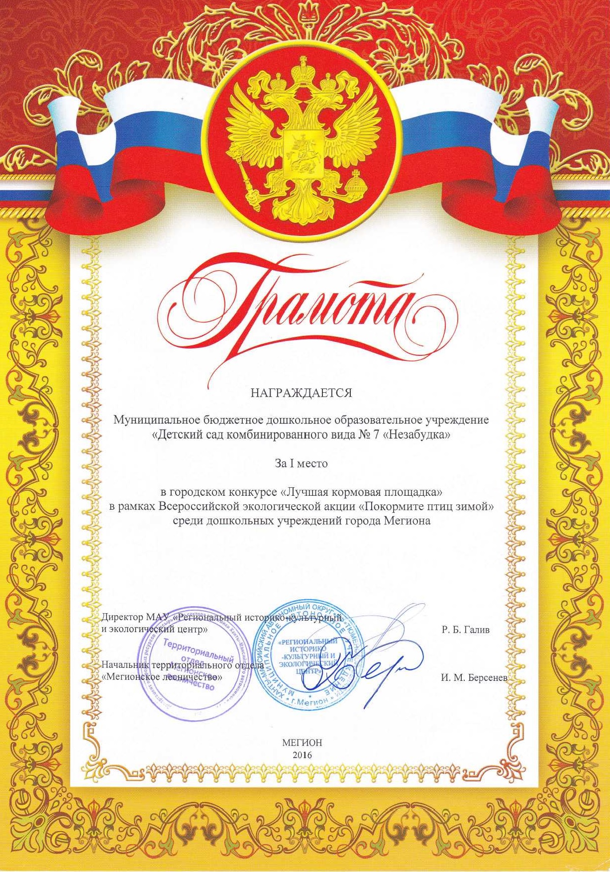 Диплом победителя городского конкурса на новогоднее оформление территорий "Мой зимний дворик" "Мегион ПРО чудеса" |
