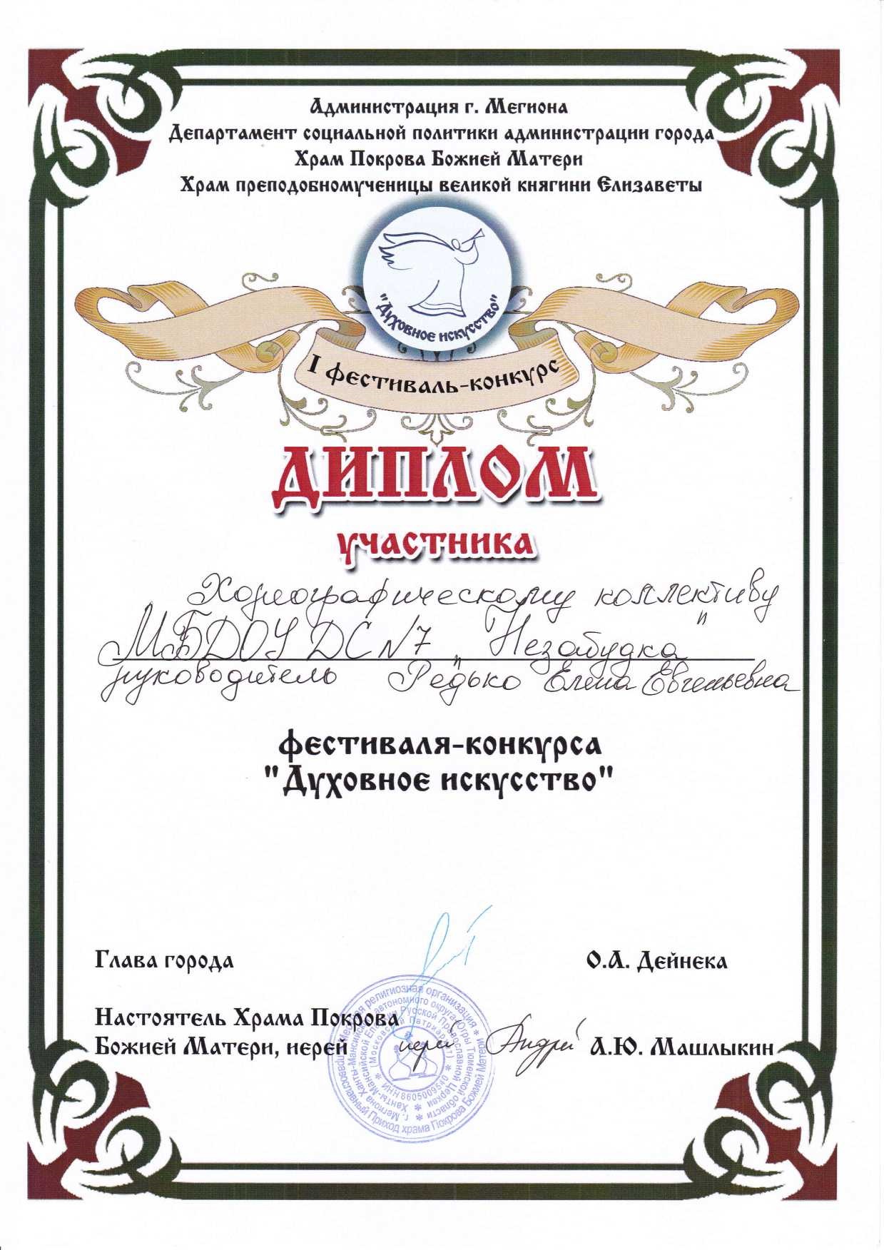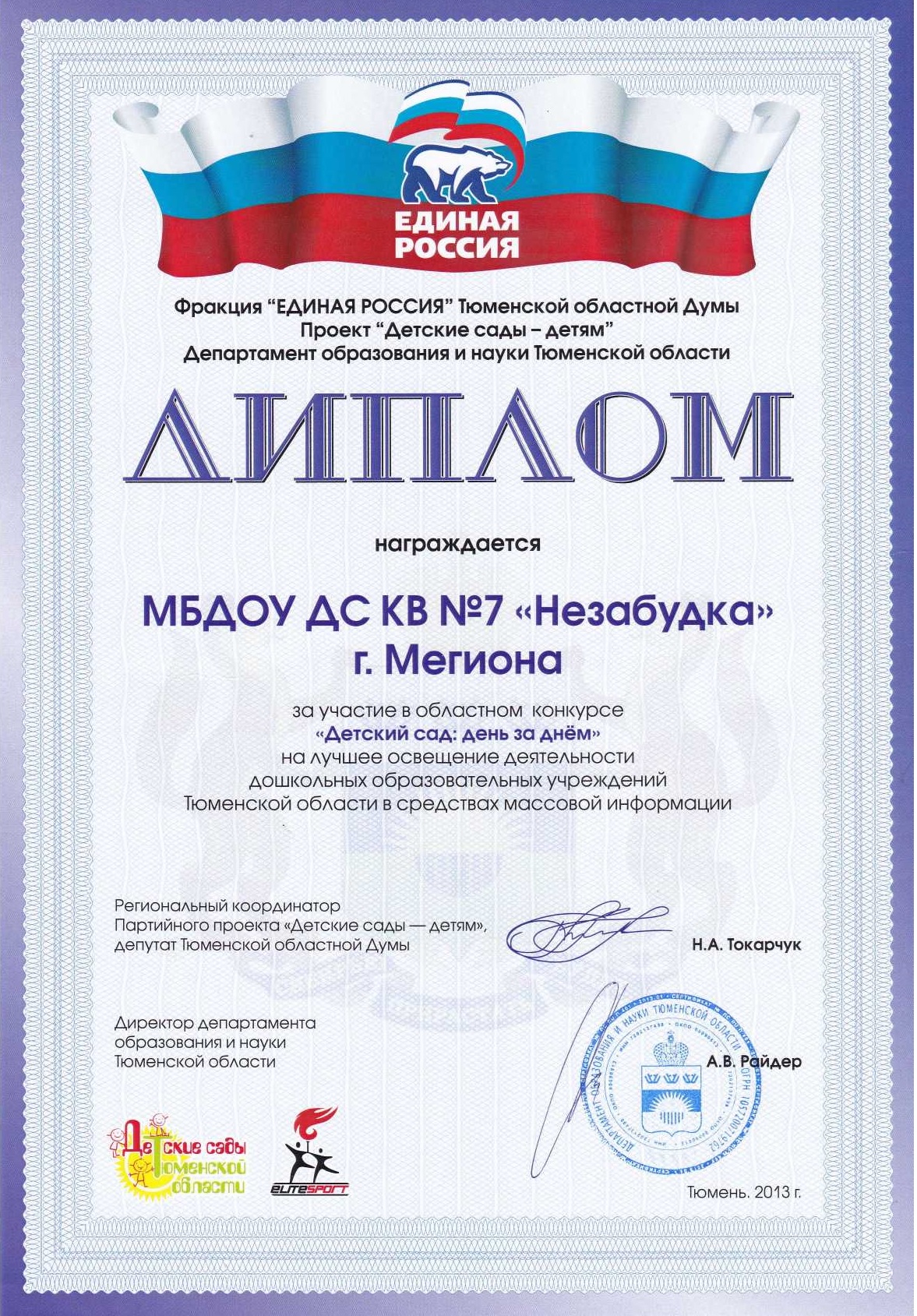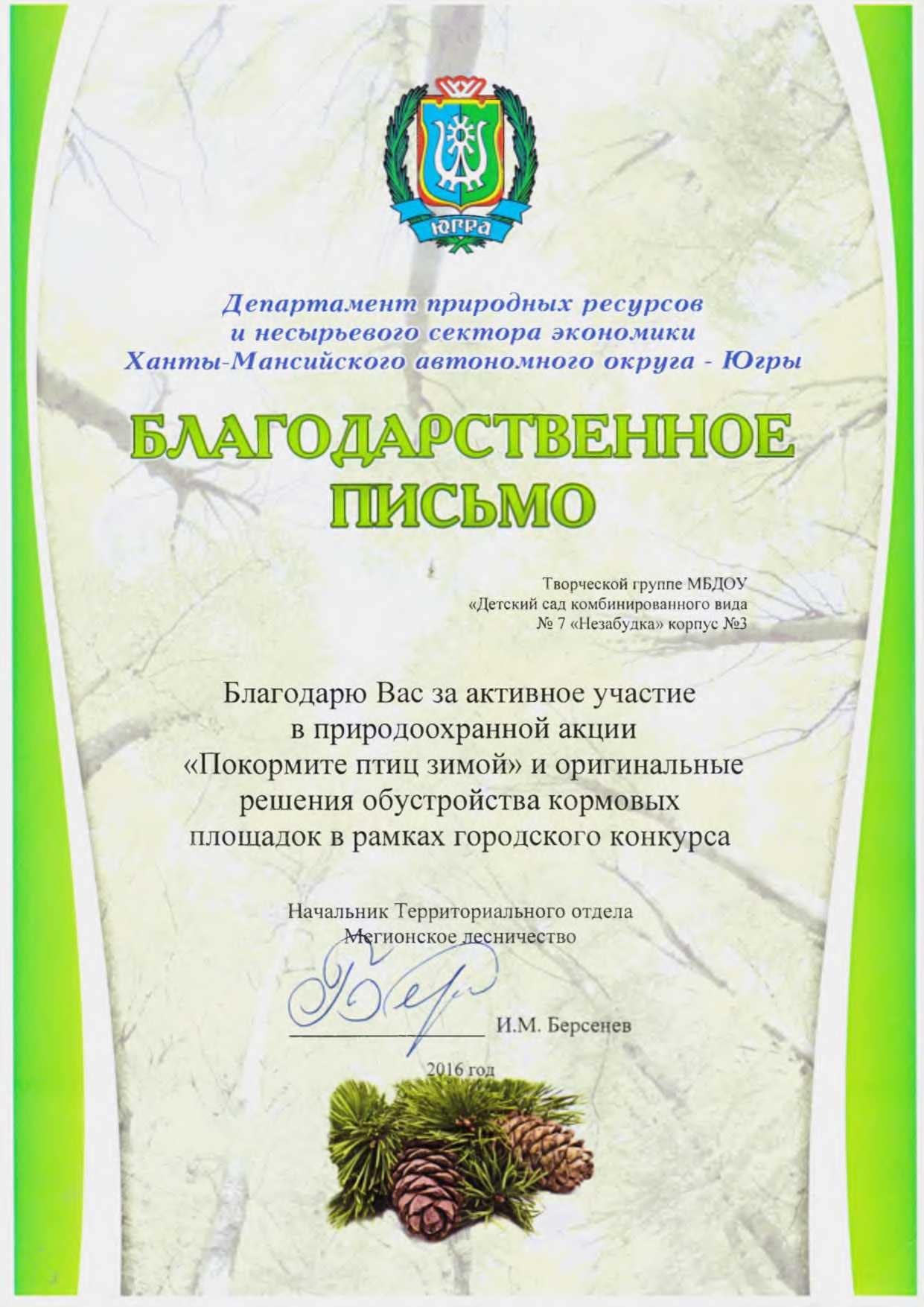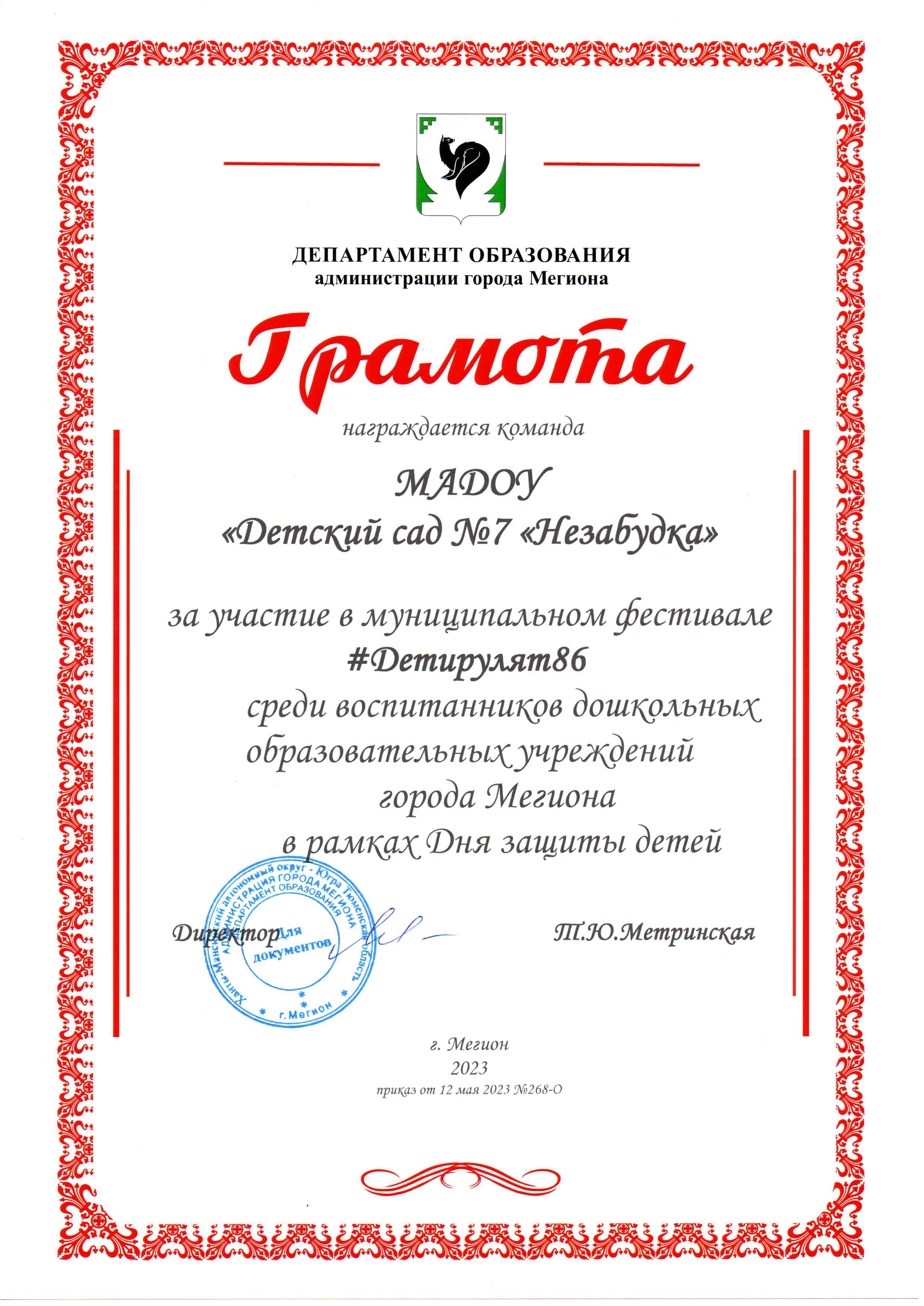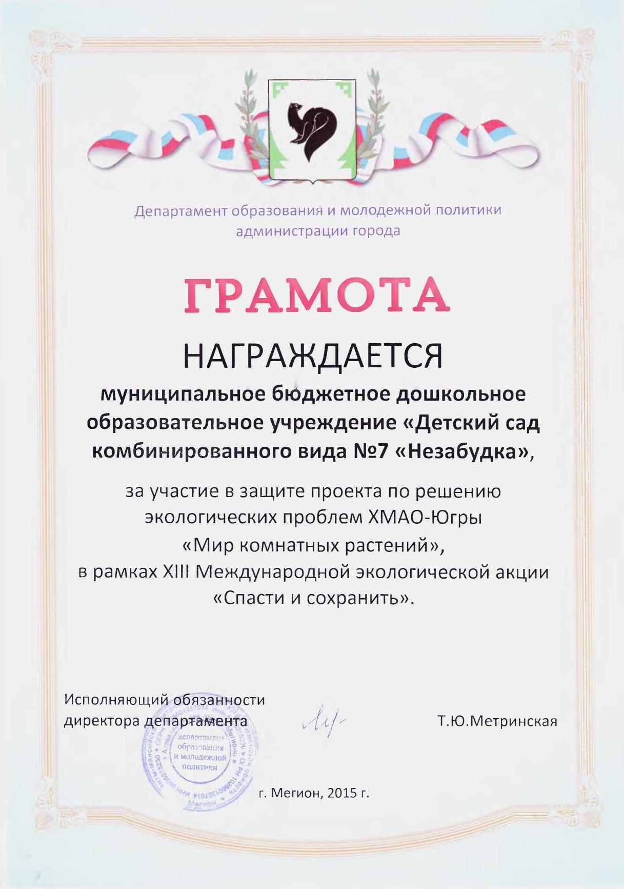 Диплом победителя городского конкурса на новогоднее оформление территорий "Мой зимний дворик" "Мегион ПРО чудеса" |