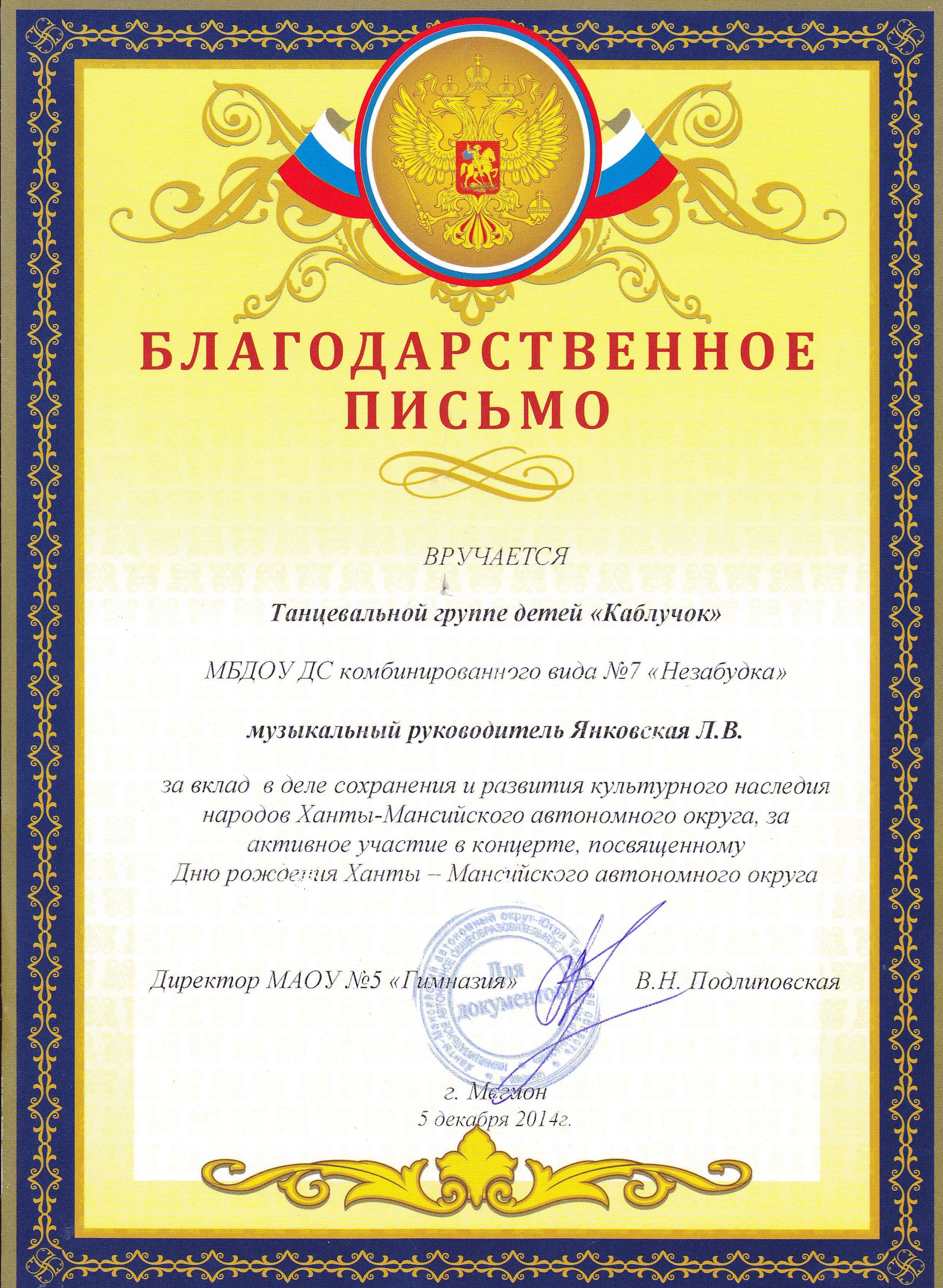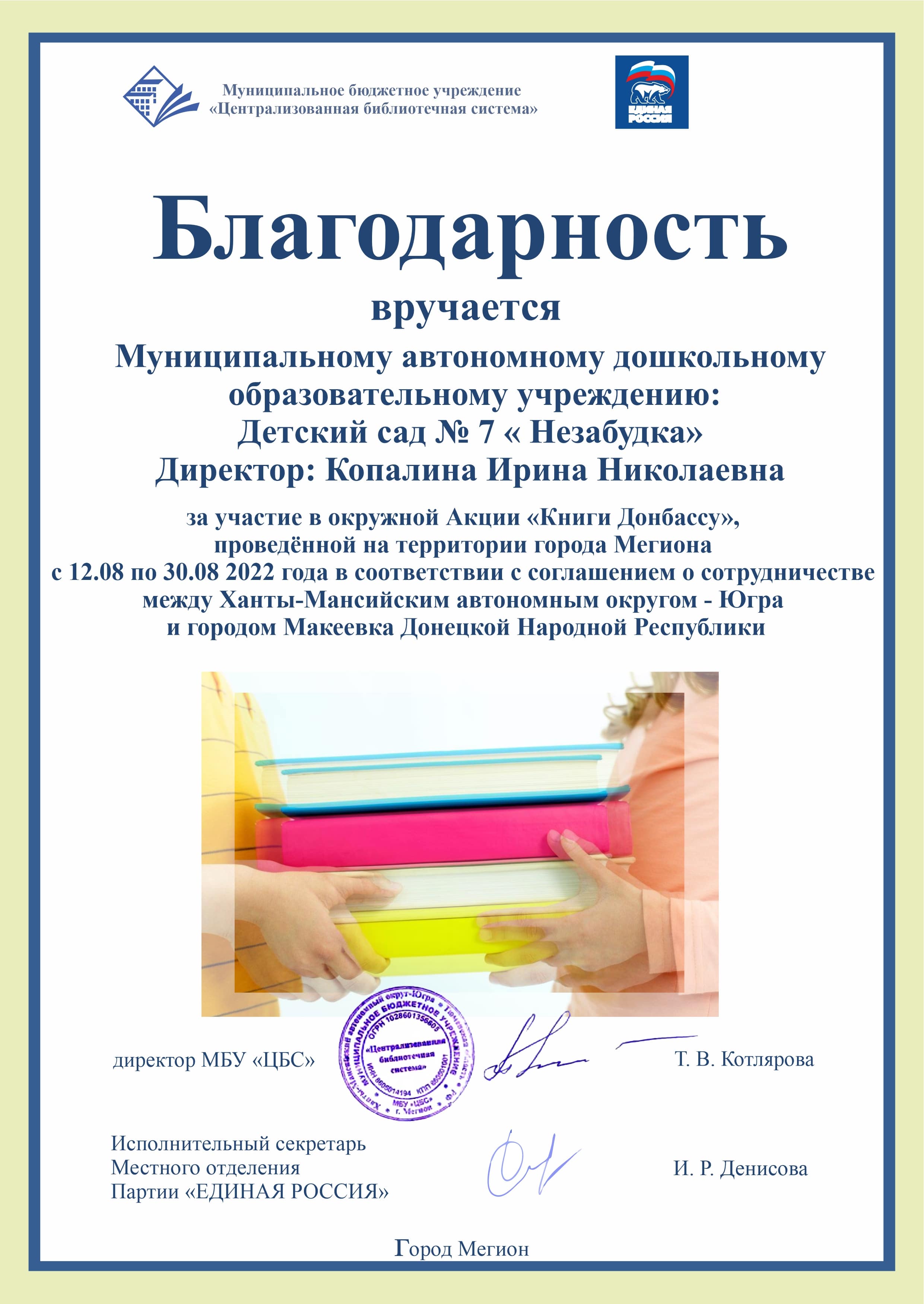 Благодарность за участие в окружной акции "Книги Донбассу" |