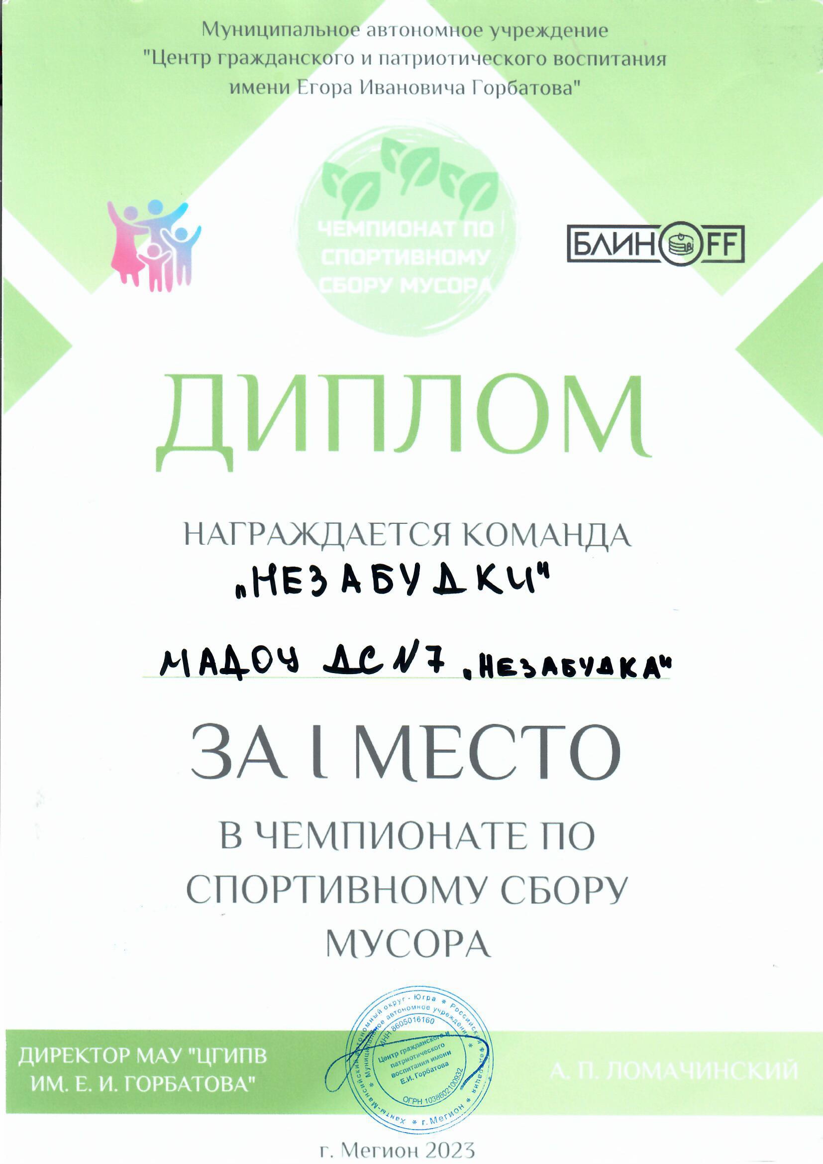 Диплом победителя чемпионата по спортивному сбору мусора |